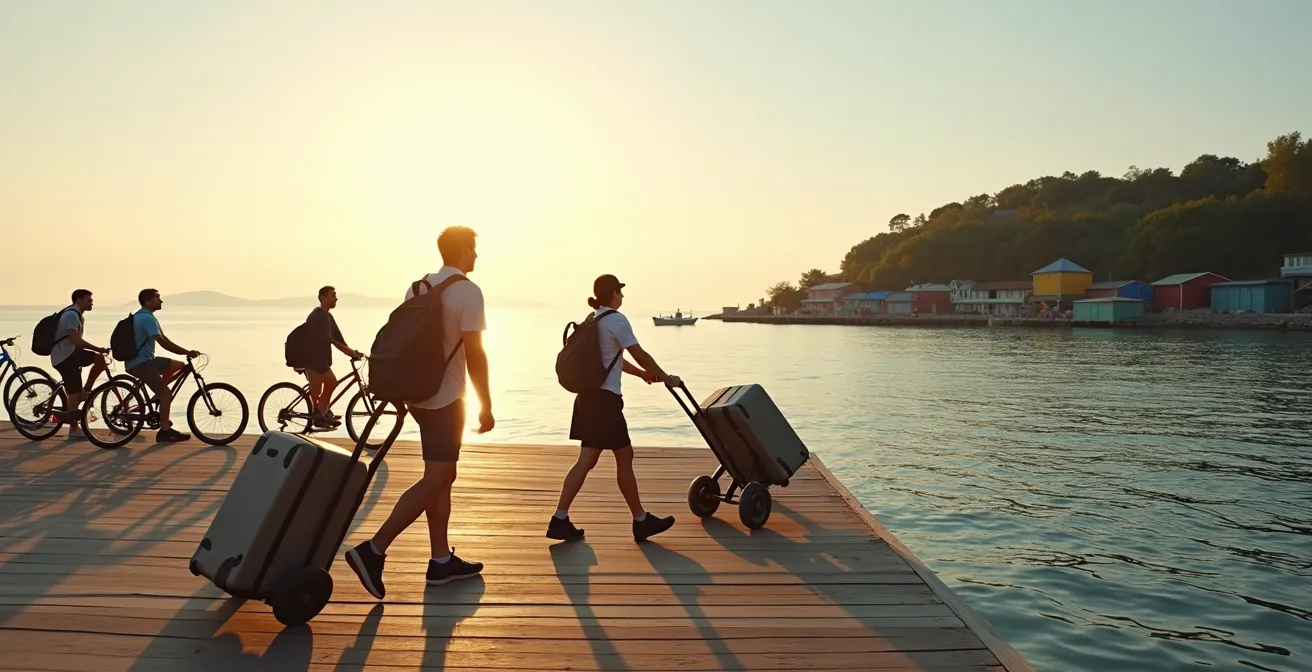 L’image est parfaite : une île baignée de soleil, le bruit des vagues, les enfants qui courent sans danger et pas une seule voiture à l’horizon. C’est la promesse d’une déconnexion totale. Mais pour une famille, cette carte postale idyllique se heurte souvent à un mur, celui de la logistique. Comment transporter une semaine de courses, trois valises, une poussette et les jouets de plage du débarcadère jusqu’à la location, à 15 minutes de marche ? Le passage du « tout-voiture » au « tout-à-pied » est un choc culturel qui peut transformer le premier jour de vacances en épreuve de force.
