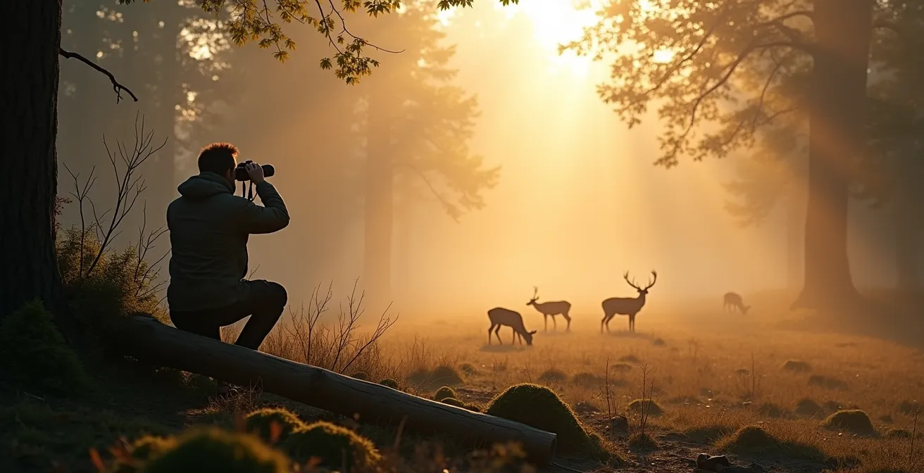 La plupart des mammifères, comme les cerfs, les chevreuils ou les chamois, sont principalement actifs à l’aube et au crépuscule. Ce sont les « heures dorées » non seulement pour la lumière photographique, mais surtout pour l’activité biologique. Durant ces périodes, les animaux se déplacent pour s’alimenter, profitant de la faible luminosité pour se protéger des prédateurs. Le milieu de la journée est souvent consacré au repos, à la rumination et à la conservation de l’énergie. Observer à l’aube ou au crépuscule maximise donc vos chances de voir des animaux en activité, mais cela augmente aussi votre responsabilité.